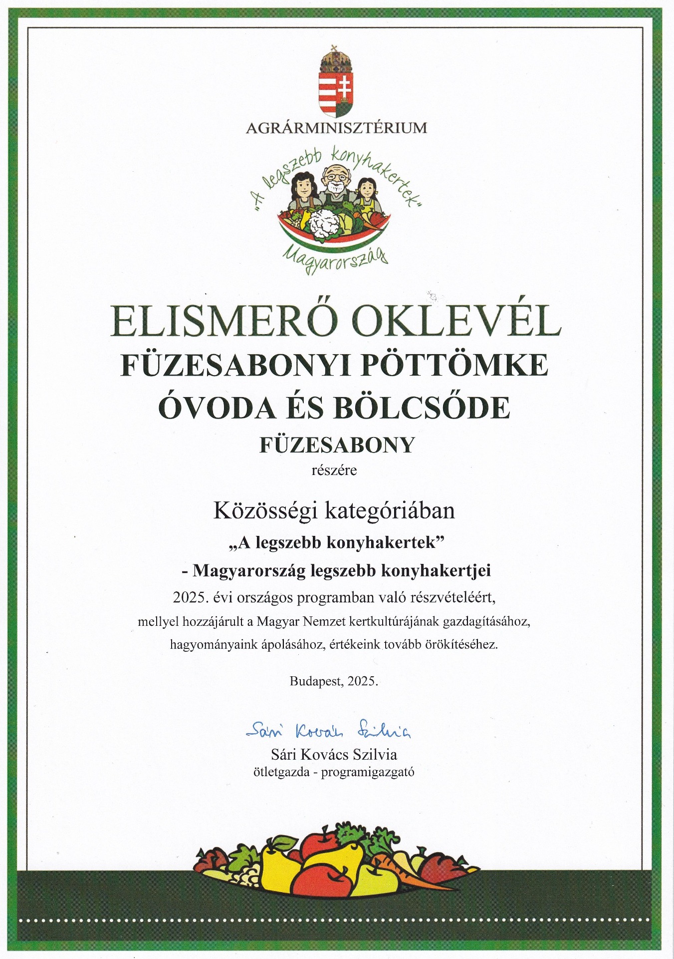 Intézményünk Elismerő Oklevélben részesült " A legszebb konyhakertek" - Magyarország legszebb konyhakertjei Magyar Örökség Díjas országos programban.